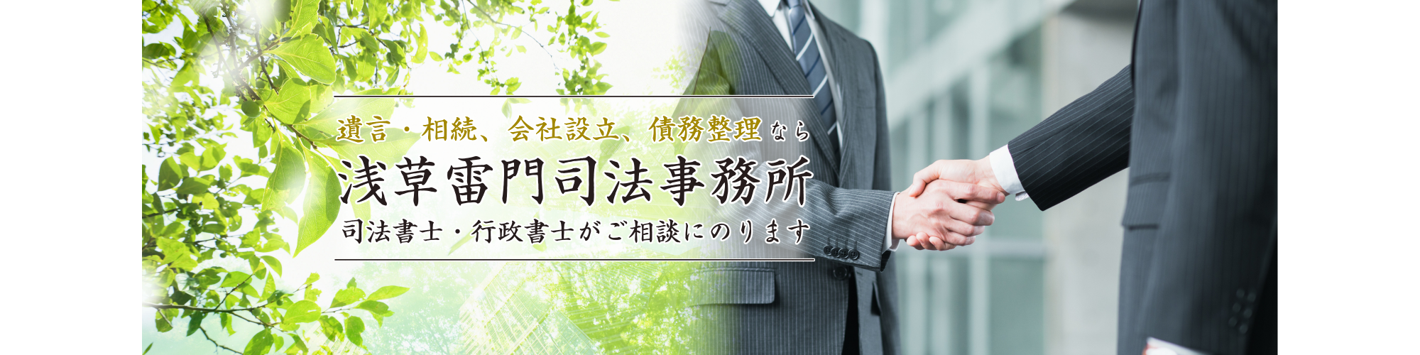 台東区・墨田区の司法書士・行政書士事務所です。遺言、相続、成年後見、会社設立、古物商・宅建業許認可、ローン借り換え、抵当権抹消、債務整理など司法書士・行政書士がご相談にのります。浅草駅徒歩2分と便利です。